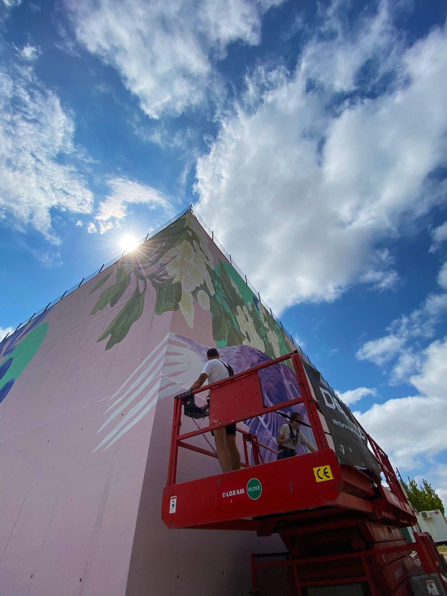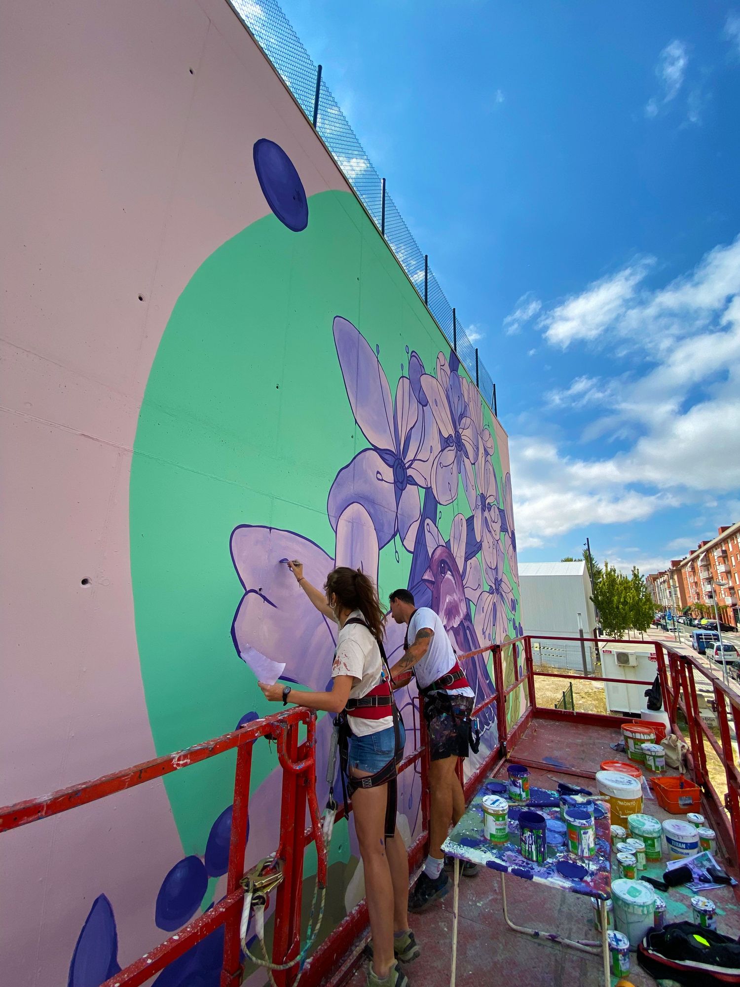 En cuanto a la ejecución, debido a la altura y dimensiones de los muros, se utiliza una grúa de tijera y el mural se realiza con pintura plástica para fachadas, que ofrece una mayor durabilidad por su pigmento más resistente al sol y al agua, y con brochas y rodillos de diferentes calibres dependiendo de la zona a trabajar. Al finalizar el trabajo, se aplicará un barniz protector para preservar la obra en el tiempo y prevenir posibles arañazos en la zona inferior.