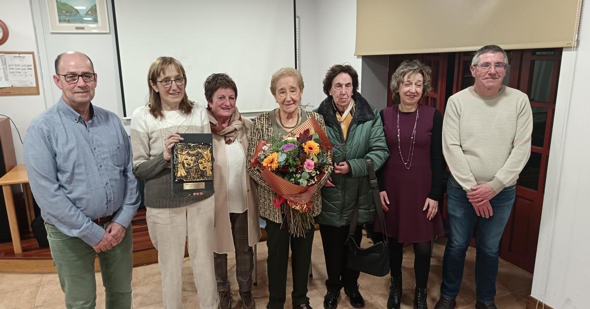 “Triple cargo”, bromeó Kortabarria. Tere, de 91 años, es madre de tres hijas, abuela de cuatro nietas y bisabuela de un biznieto. Al homenaje acudieron una de sus hijas, su hermana y otros familiares, que no quisieron perderse un acto tan especial, amenizado por las voces del coro Aloña. Como recuerdo, recibió un cuadro del artista Iñaki Jauregialtzo “Jaltzo” —un guiño perfecto a su afición por el teatro- y un ramo de flores.