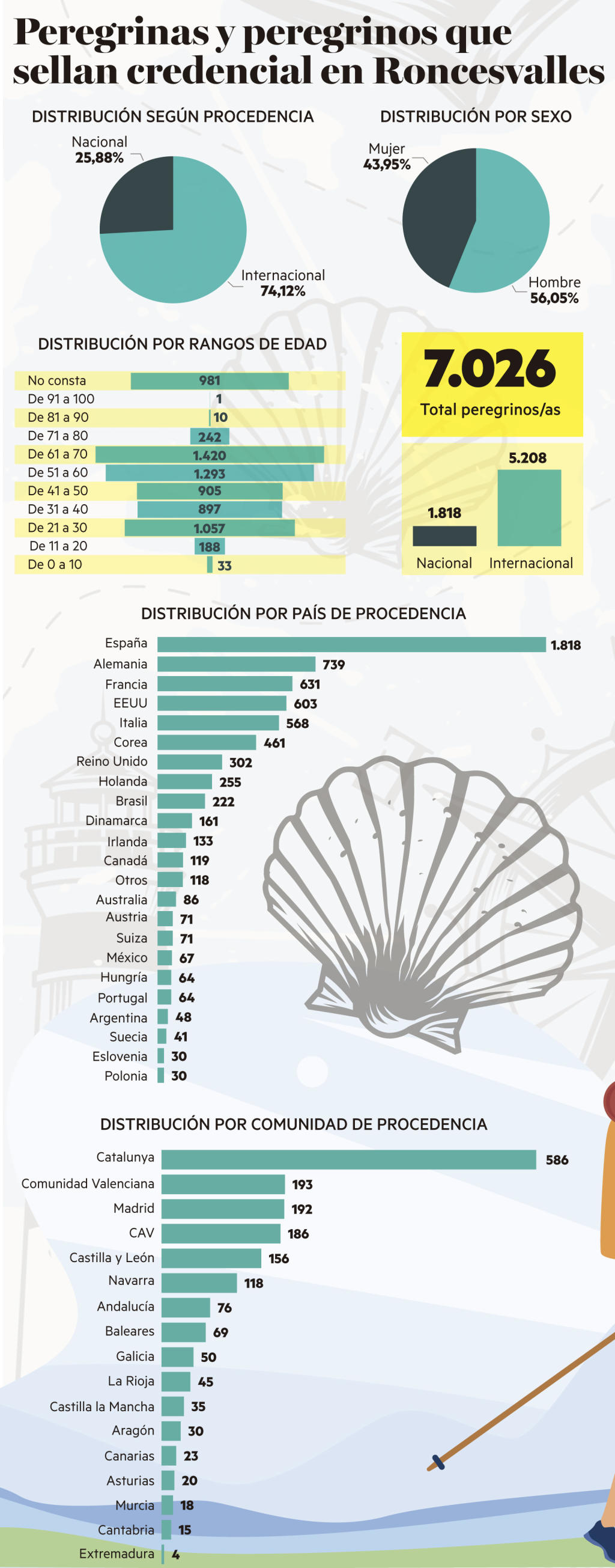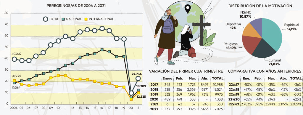 Mochilas, sombreros y conchas colgadas al cuello. Los peregrinos, tras dos años de impás, recorren de nuevo El Camino de Santiago. Según el Observatorio Turístico de Navarra, desde el 1 de enero y hasta el 30 de abril, 7.026 personas han sellado su credencial en Roncesvalles, un 30% menos que en el mismo periodo de 2019, cuando lo realizaron 9.975. La recuperación, con la pandemia aún coleando, es paulatina, pero hay otros datos más esperanzadores que apuntan en la dirección contraria: hasta mediados de abril, cerca de 25.400 peregrinos habían llegado a Santiago de Compostela, una cifra récord que supone un 30% más que en 2019. Otro termómetro son los albergues, que han arrancado la temporada con buenas sensaciones, en Semana Santa han colgado el cartel de completo y confían en que el elevado nivel de ocupación se prolongue durante los próximos meses. El peregrino retoma a El Camino.