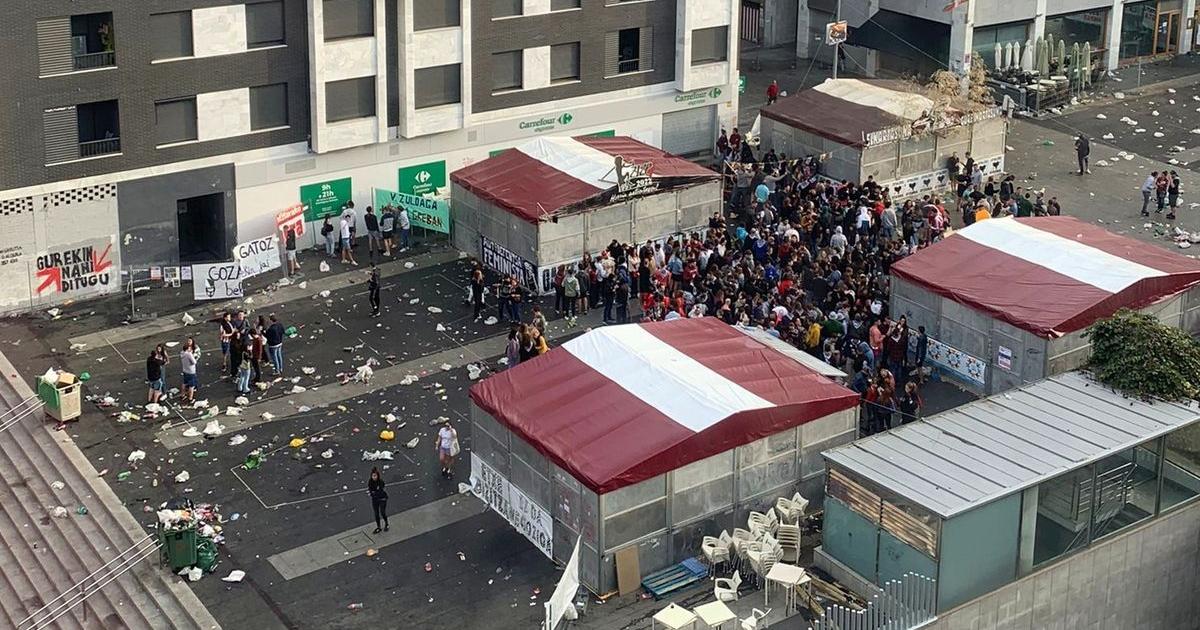 Recinto de txosnas con gente a las nueve de la mañana.