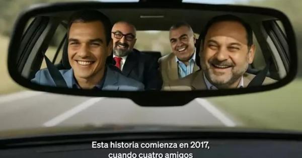 "Esta historia comienza en 2017, cuando cuatro amigos se recorrieron España en un peugeot para ganar las primarias del PSOE. Y lo consiguieron. E incluso llegaron al Gobierno", comienza el vídeo con una locución en off durante la cual se muestra a Sánchez, Ábalos, Koldo García y Cerdán a través del espejo retrovisor de un coche, e incluso a la esposa del presidente del Ejecutivo, Begoña Gómez, despidiéndoles.