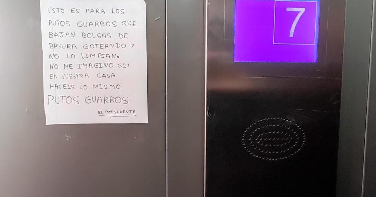 “Esto es para los putos guarros que bajan bolsas de basura goteando y no limpian. No me imagino si en vuestra casa hacéis lo mismo. PUTOS GUARROS. El presidente”.