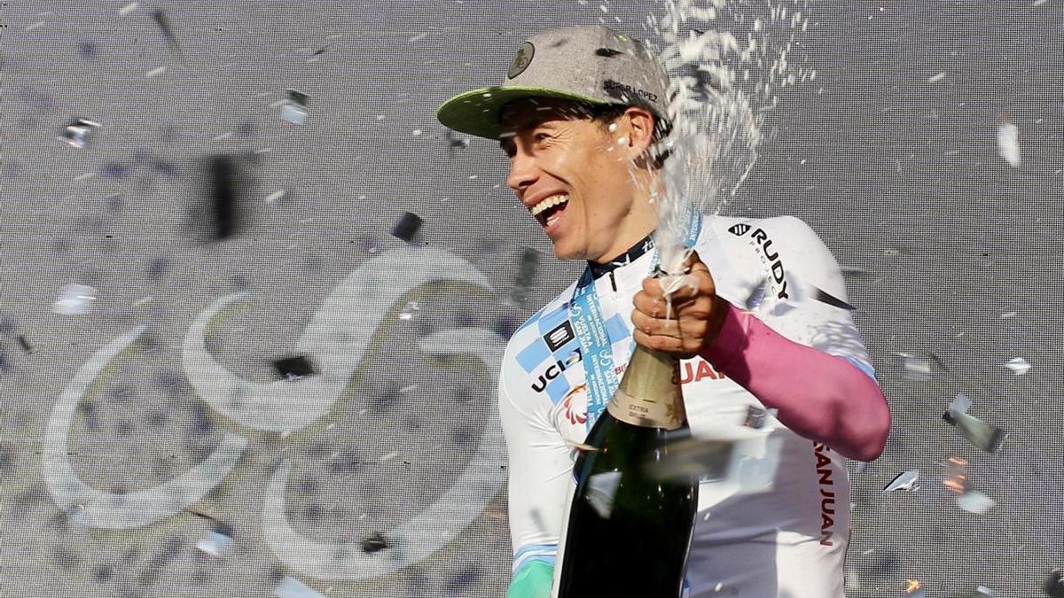 Miguel Ángel López festeja el liderato en la Vuelta a San Juan.