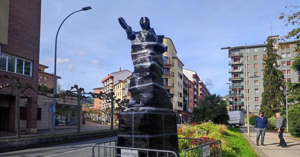 En ese momento se descubrirá la escultura de Antonio Oteiza, dando la oportunidad de ver su aspecto final a los que asistan al acto que ha organizado el Ayuntamiento de Azkoitia, tras haber permanecido oculto bajo capas de plástico negro desde su colocación en su emplazamiento definitivo el pasado martes.