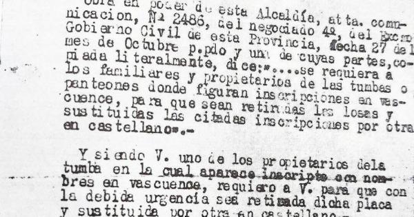 Si en 1923, una ley de Primo de Rivera prohibía el uso del euskera en eventos públicos, 1937 marcó el inicio de la ofensiva lingüística. Con el avance del Ejército sublevado en el norte, hablar euskera pasó a ser un acto de desobediencia. Las autoridades franquistas lo consideraban un obstáculo para la "unidad de España", una amenaza al proyecto nacional-católico que buscaba uniformidad cultural y lingüística bajo el lema Una, grande y libre. Solo un año después, en 1938, el euskera fue eliminado de los registros públicos. Los nombres y apellidos vascos fueron castellanizados, y los documentos oficiales debían redactarse exclusivamente en castellano. Al año siguiente, la prohibición se extendió a los hoteles y comercios: ningún rótulo podía incluir palabras vascas. Los nombres tradicionales de los pueblos fueron sustituidos por versiones castellanizadas, y la geografía vasca se reescribió, literalmente, sobre los mapas y las fachadas.