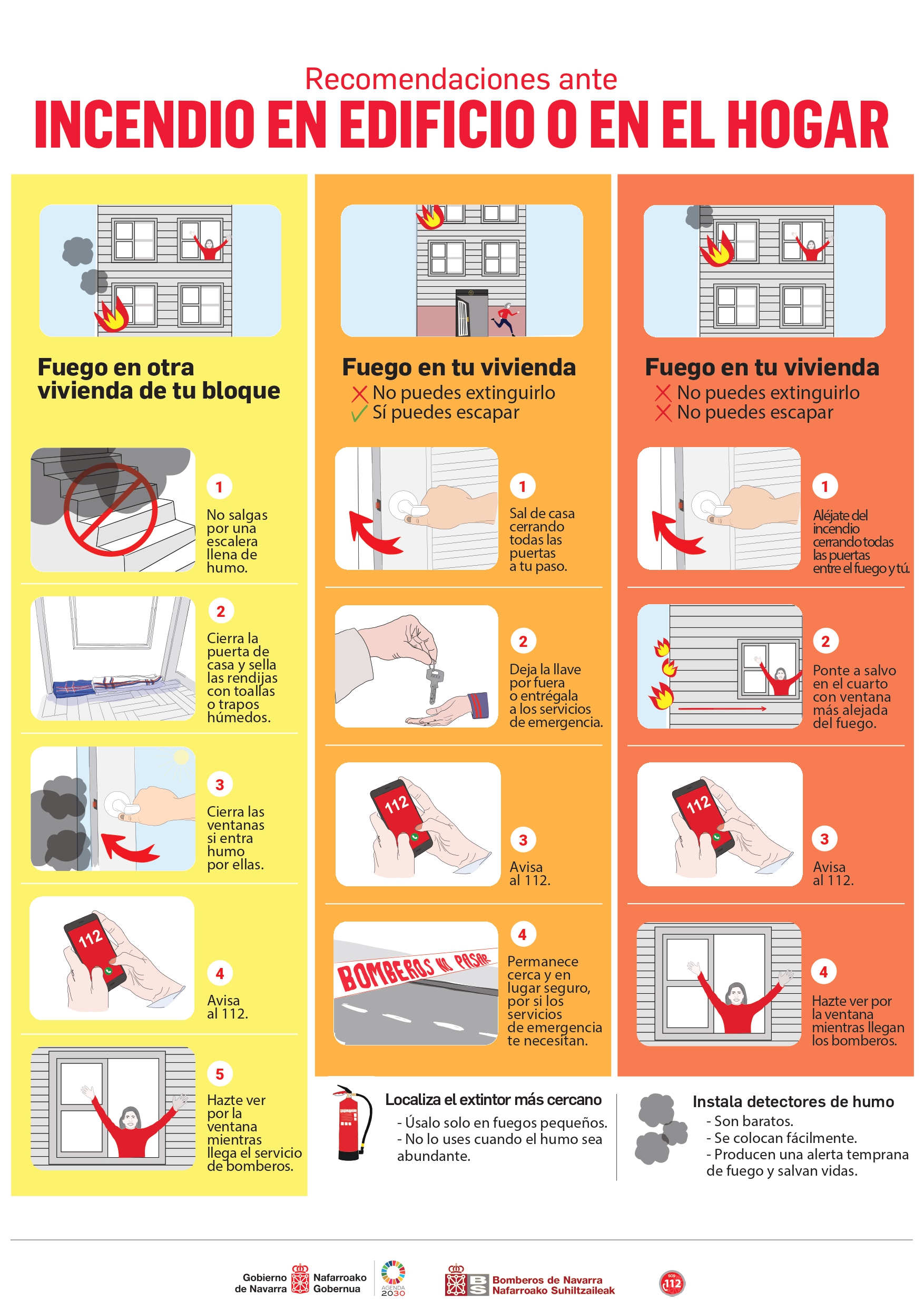 El Servicio de Bomberos de Navarra ha elaborado un tríptico en el que ofrece a los ciudadanos indicaciones sobre cómo actuar en las tres situaciones que pueden darse en los incendios de vivienda. Estos mismos consejos, tales como evitar salir de la vivienda si hay humo en la escalera, o cerrar la puerta de la habitación afectada por el fuego, están también disponibles en formato audiovisual, para su fácil entendimiento y difusión.