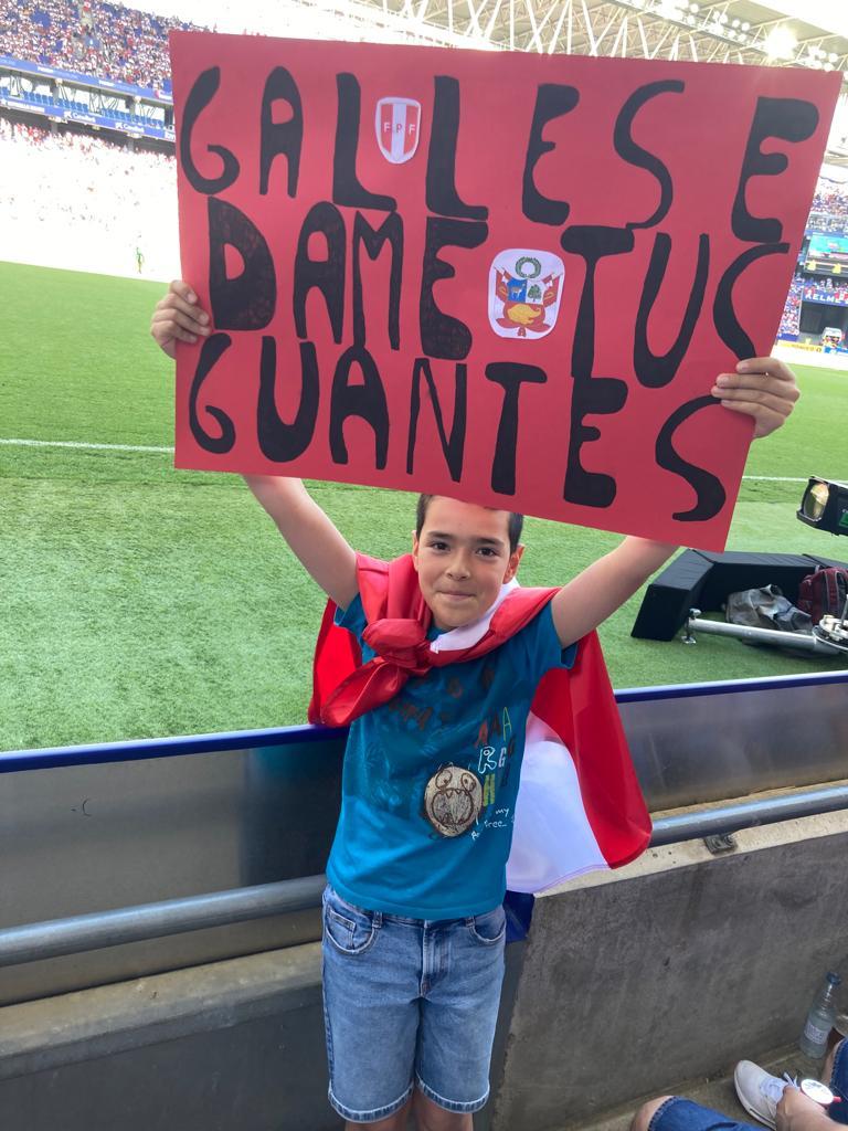 Portero de afición, Gustavo entró al feudo perico luciendo una bandera de su país y portando una pancarta en la que rezaba un mensaje dirigido hacia Pedro Gallese, guardameta titular y capitán de la blanquirroja, a quien le pedía los guantes en una cartulina roja con el escudo de Perú en el centro. En un primer momento, el pequeño Gustavo, como relata su padre –también Gustavo– se marchó con las manos vacías.