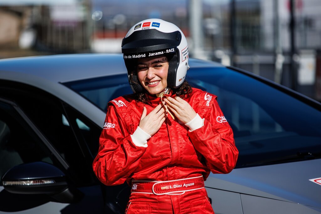 Ayuso se paseó entre los coches y motos clásicas del circuito, entre ellas la Derbi de Ángel Nieto y algún que otro deportivo de alta gama antes de un mono y casco de competición, junto al presidente del RACE y responsables de los cursos de conducción, y dar unas cuantas vueltas al trazado como copiloto y luego piloto sobre un Cupra Born eléctrico, ya que el trazado también se vuelca con la electrificación para acoger competiciones y actividades eléctricas.