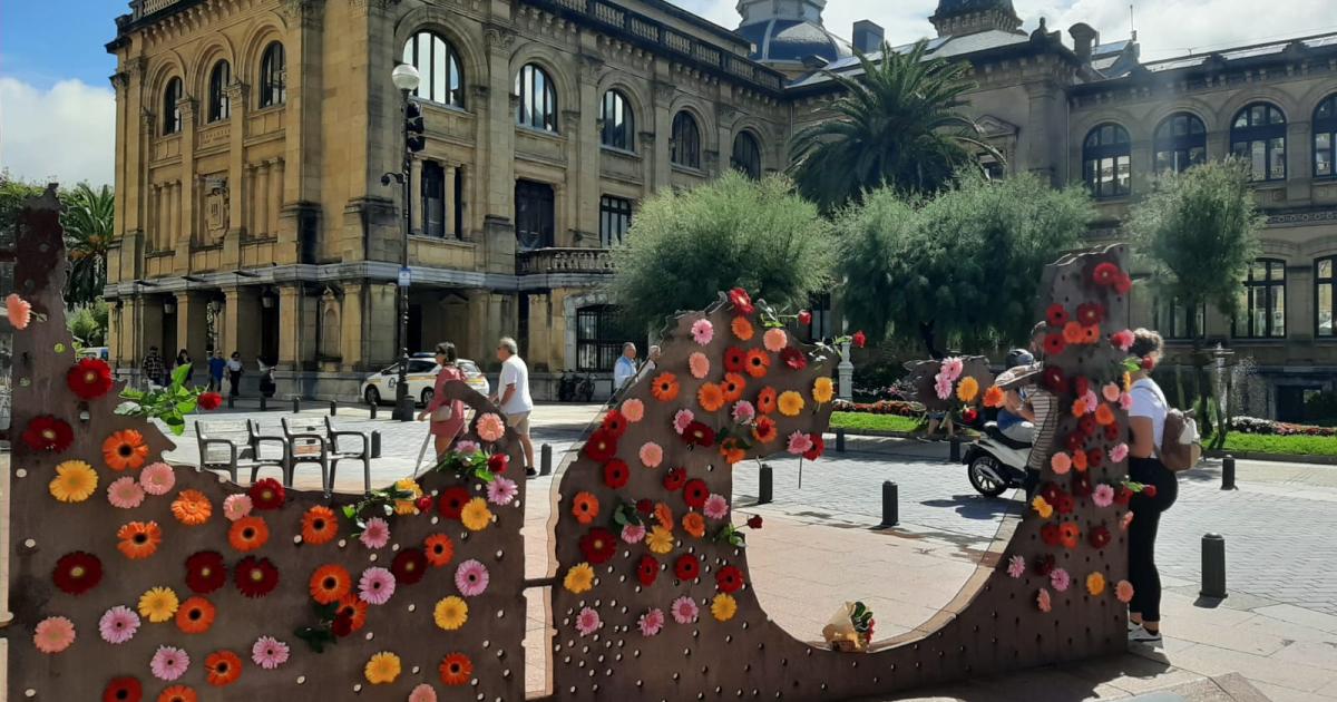 El acto ha comenzado con los sones interpretados por la Banda Municipal de Txistularis, seguidos de la música del violín y violonchelo que han acompañado la danza de un bailarín de Kukai Dantza Taldea. Tras este emotivo momento, los asistentes han colocado grandes margaritas de colores en los agujeros de la escultura 'Dual'. Una ofrenda floral en la que han participado miembros de todos los partidos políticos y de todas las instituciones guipuzcoanas. Al frente, el alcalde de Donostia Eneko Goia que ha estado acompañado de toda la corporación municipal, del Ararteko Manuel Lezertua y del presidente de las Juntas Generales de Gipuzkoa Xabier Ezeizabarrena, entre otros.