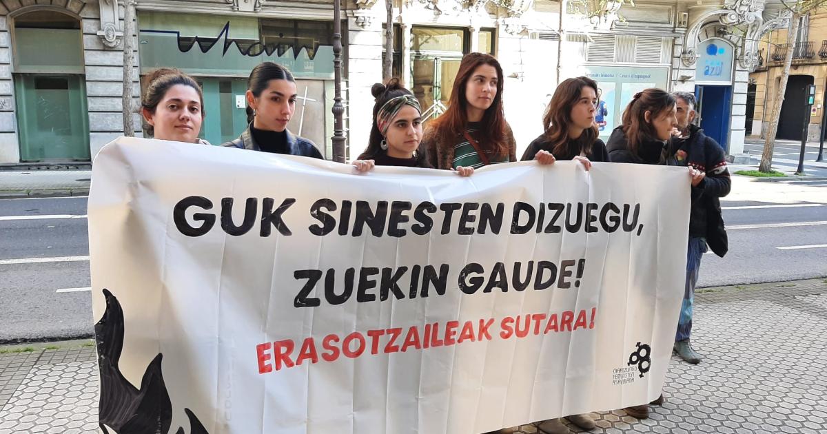 Hoy Claudia tiene 22 años de edad y esta mañana ha querido mostrar su apoyo a las tres presuntas víctimas del acusado, inmersas en el juicio que comienza hoy. "Yo hablo desde mi experiencia y hemos escuchado todo este tipo de comentarios... vamos, que es un impresentable y un sinvergüenza". Junto a otras jóvenes, esta mañana, ha mostrado una pancarta ante la Audiencia de Gipuzkoa en la que se podía leer en euskera 'Guk sinesten dizuegu, zuekin gaude! Erasotzaileak sutara' (Nosotras os creemos ¡estamos con vosotras! Los agresores al fuego).