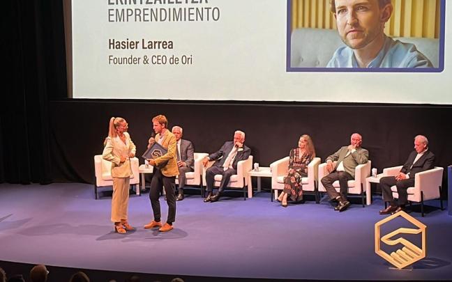 La ceremonia prosiguió con el reconocimiento al 'Emprendimiento', como exponente desde hace siglos de nuestra identidad, para el ingeniero donostiarra Hasier Larrea. El premio, entregado por el director general de Grupo Noticias Juan José Baños, destacó el espíritu resuelto del fundador de Ori Living, una compañía que está revolucionando las viviendas a través de sus soluciones robóticas. Larrea explicó que para él, "emprender es crear un camino y la razón para hacerlo tiene que ser enamorarse de un problema". El ingeniero quiso aprovechar la ocasión para agradecer los valores que le habían inculcado sus aitas, como "el optimismo y la perseverancia".