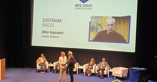 El tercer galardonado en la noche de Hitz Sariak - Premios Palabra fue el chef Bittor Arginzoniz quien recibió la distinción a las 'Raíces' por parte de Mireia Zárate, presidenta de la Fundación Sabino Arana. El cocinero del Asador Etxebarri, considerado el segundo mejor restaurante del mundo, afirmó que ha podido disfrutar de un oficio "que amo, y en el que raíces y valores se juntan en la mesa".