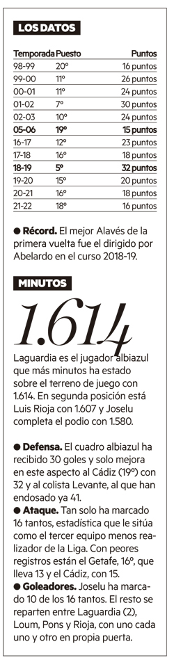 De hecho, este curso el conjunto de Mendizorroza ha igualado su segunda peor primera vuelta en la época moderna con tan solo 16 puntos en 19 jornadas. Hay que remontarse hasta la temporada 1998-99 con Mané en el banquillo para encontrar otros registros igual de escasos que los de la campaña actual.