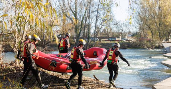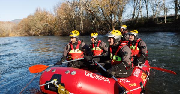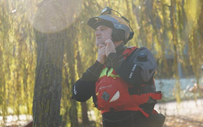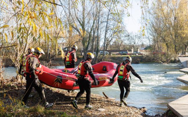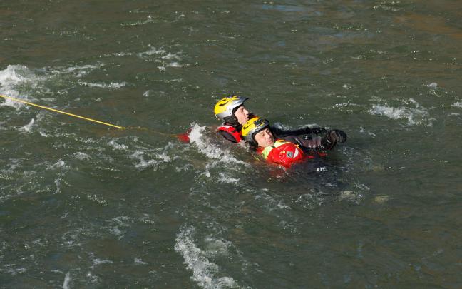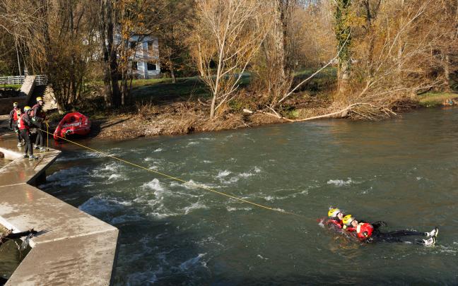 En este caso, todo acaba bien, porque la persona que flota en el río lleva un traje de buceo que le permite mantenerse en el agua fría sin entrar en hipotermia y, además, no está ahí porque se haya caído o haya sufrido un accidente. Es un buzo del Grupo de Rescate Acuático (GRA) del Servicio de Bomberos de Navarra que realiza, junto a varios compañeros, una maniobra de rescate en superficie, tal y como hacen de manera periódica, para estar preparados cuando se les necesita.