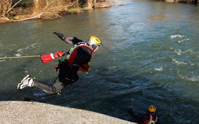 A continuación, la barca vuelve a la orilla y uno de los buzos entra despacio en el cauce y se deja arrastrar por la corriente hasta la zona de la pasarela, en la que espera otra parte del equipo, preparado para lanzar una cuerda de rescate cuando el cuerpo llega flotando a su altura.