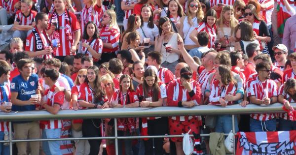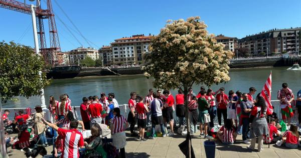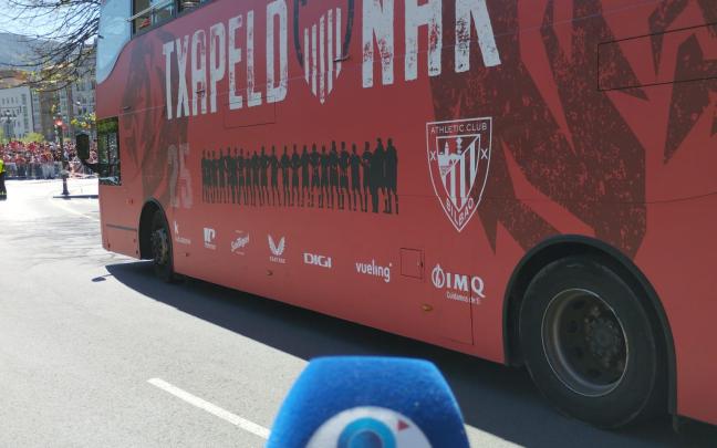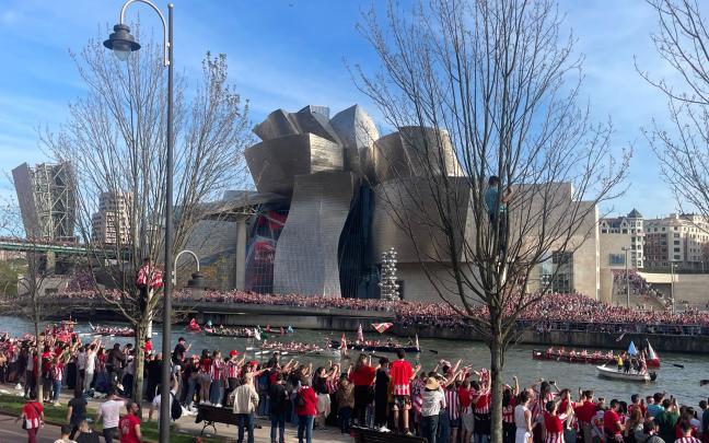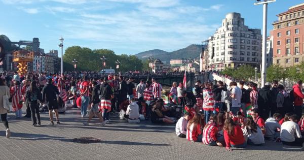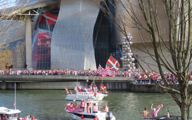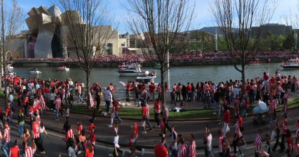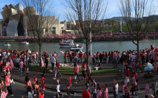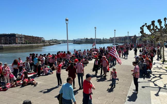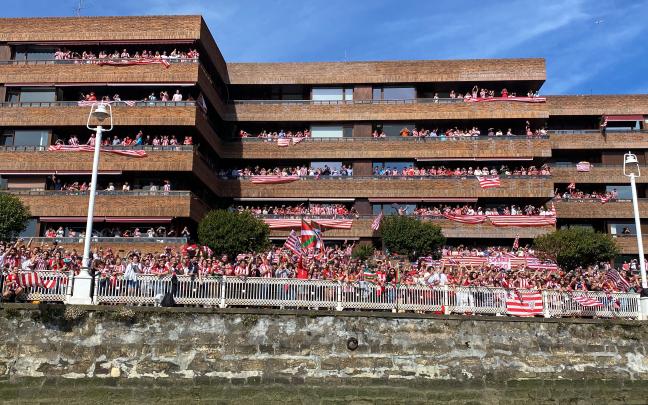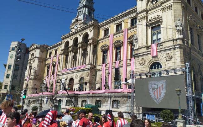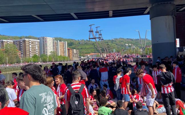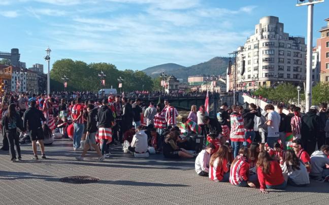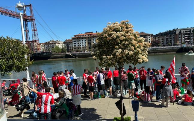 Alrededor de las 14:30 horas de la tarde, y a la espera del comienzo de la ruta de la Gabarra, cada vez son más los aficionados del Athletic que han elegido su sitio para esperar a los jugadores en la zona que rodea al ayuntamiento.