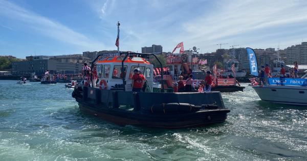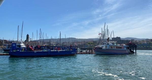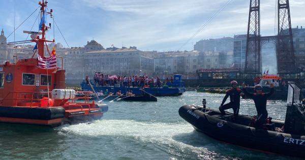 Con su salida desde Getxo a las 16:30 horas, la Gabarra, acompañada de decenas de barcos y motos de agua, finalmente pone rumbo a Bilbao a través de la ría de Bilbao.