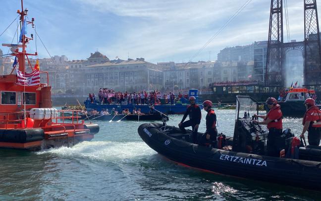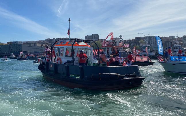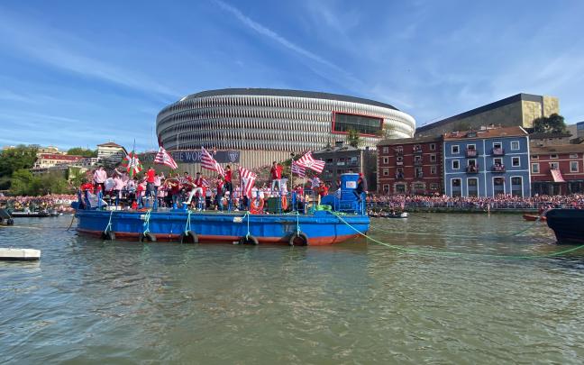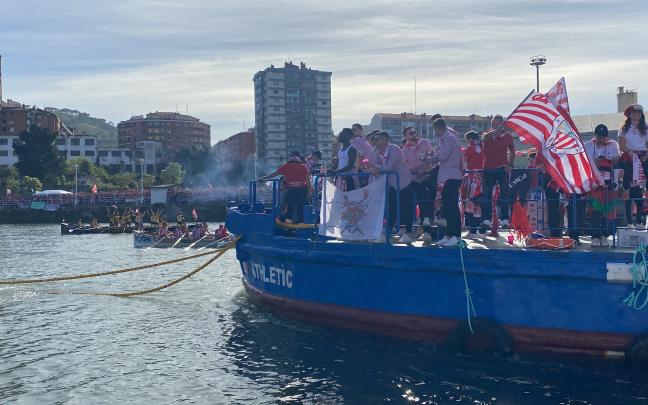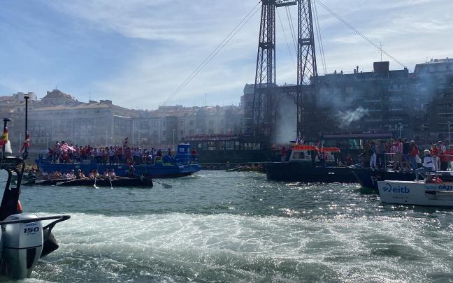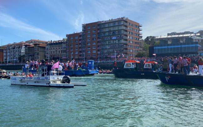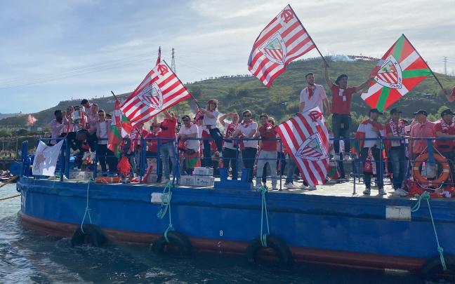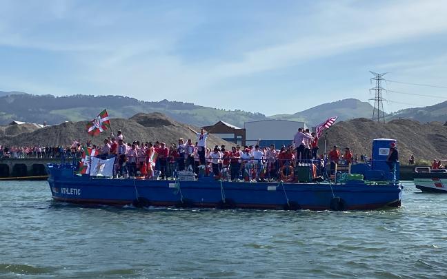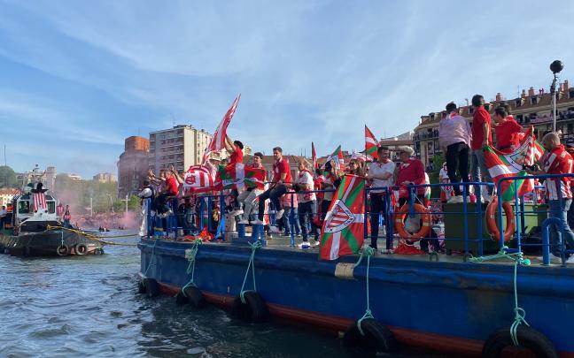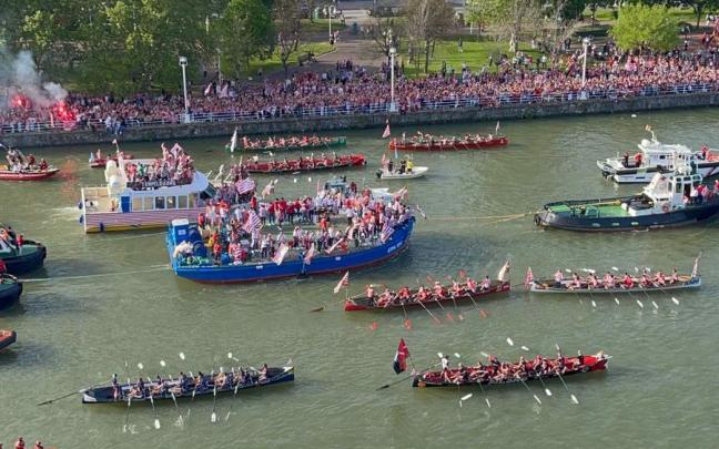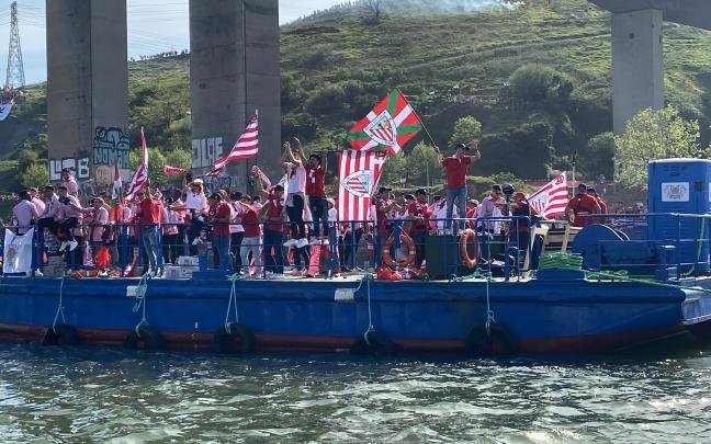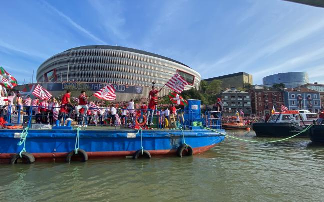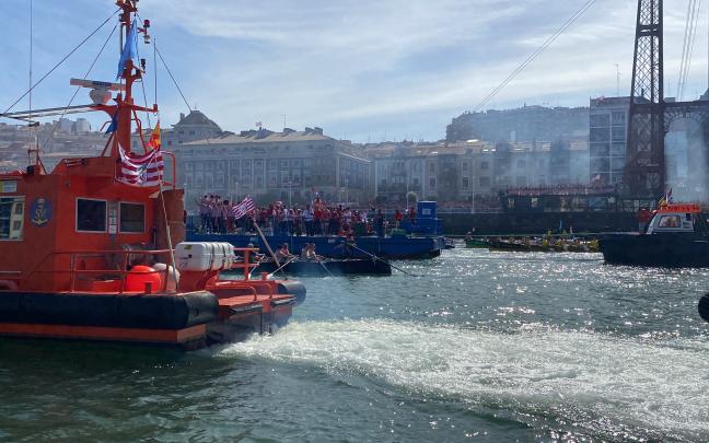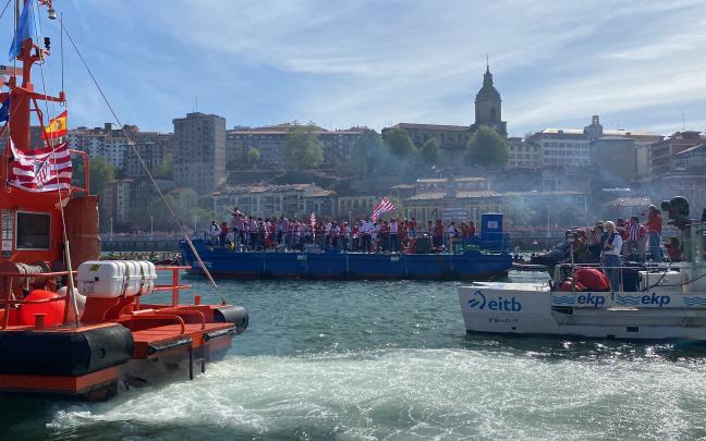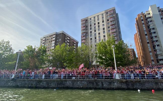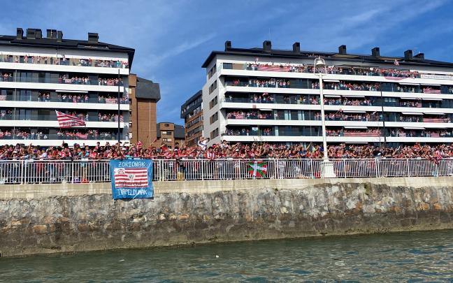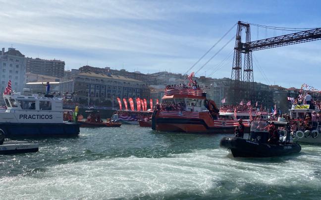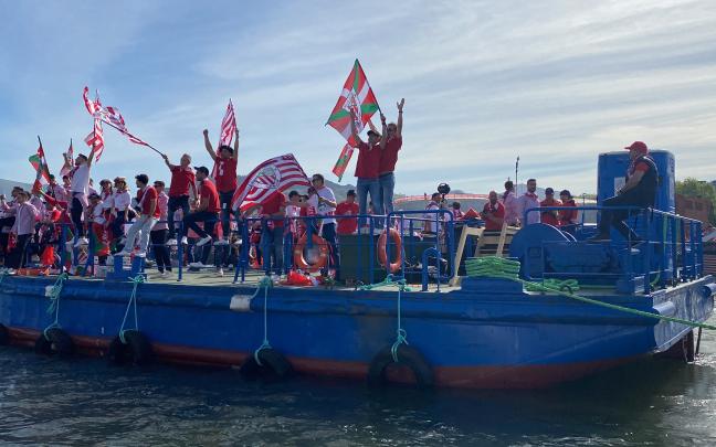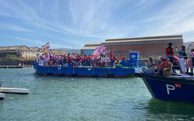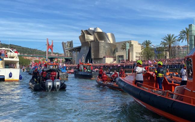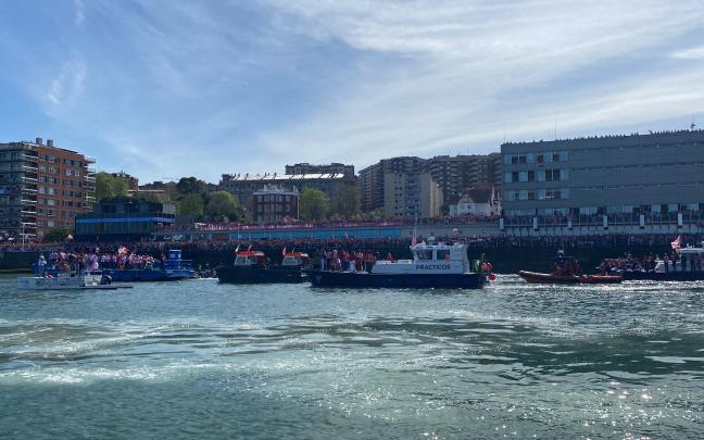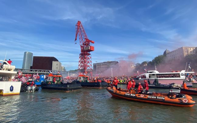 Tras su salida de Getxo, la Gabarra ya ha atravesado Lamiako rodeada de miles de aficionados.