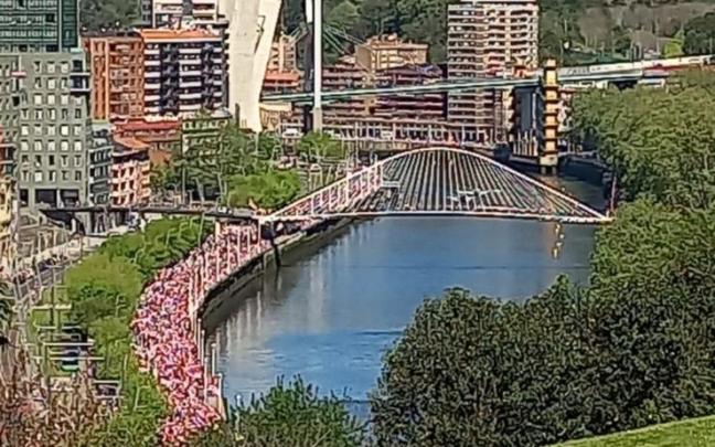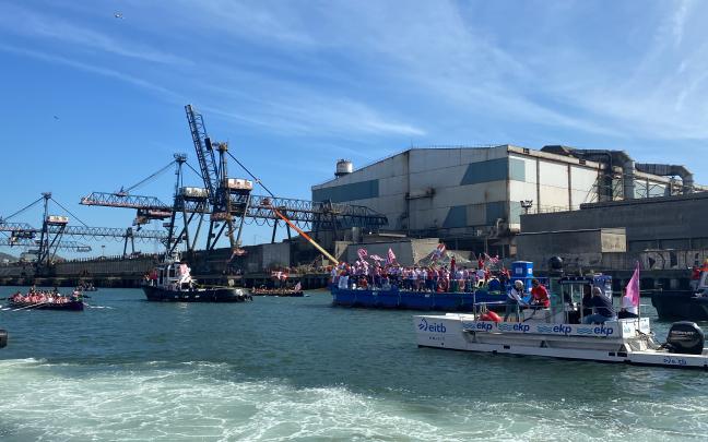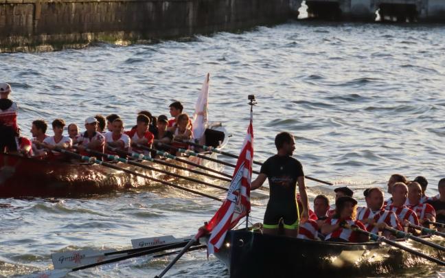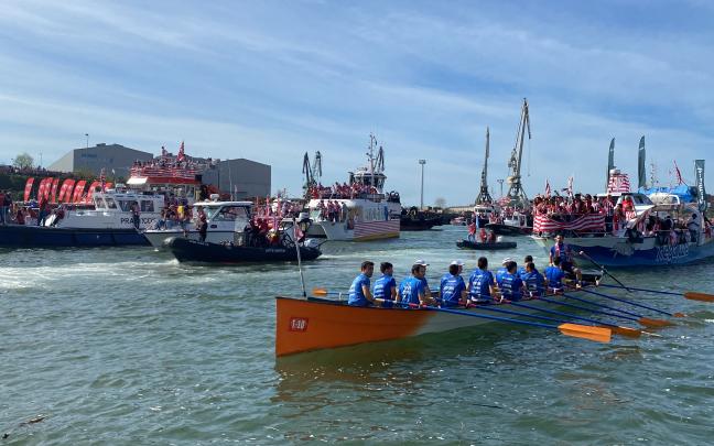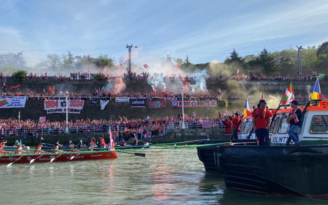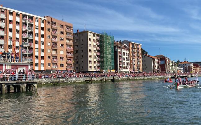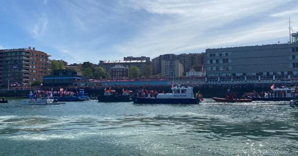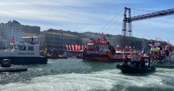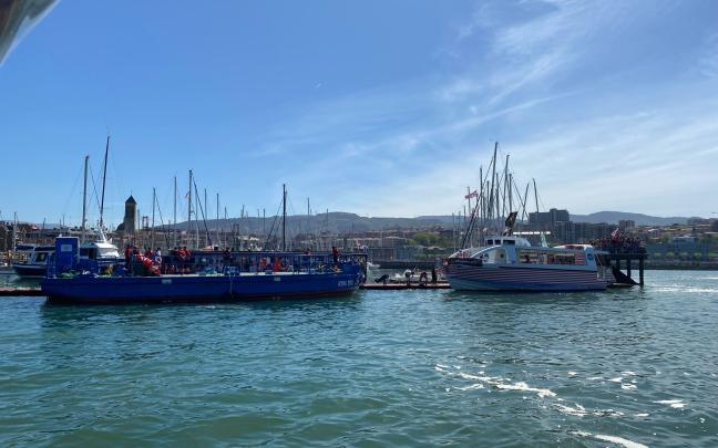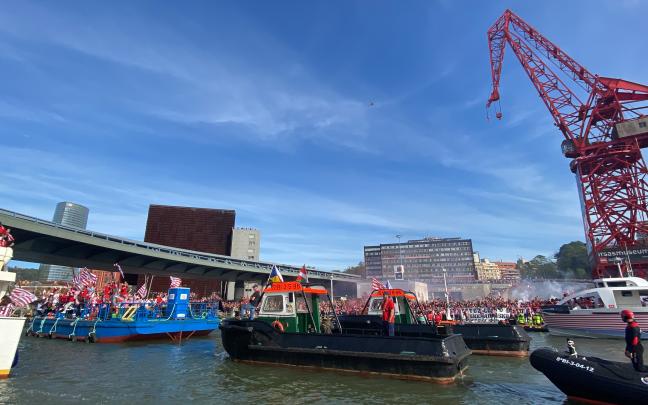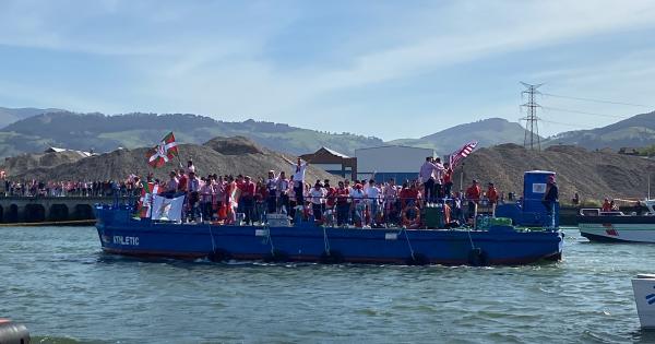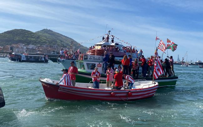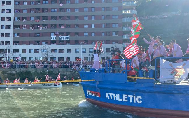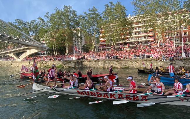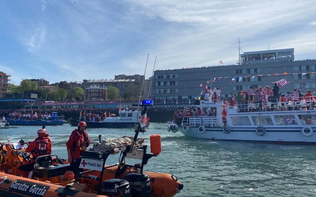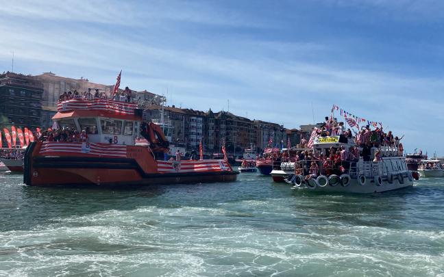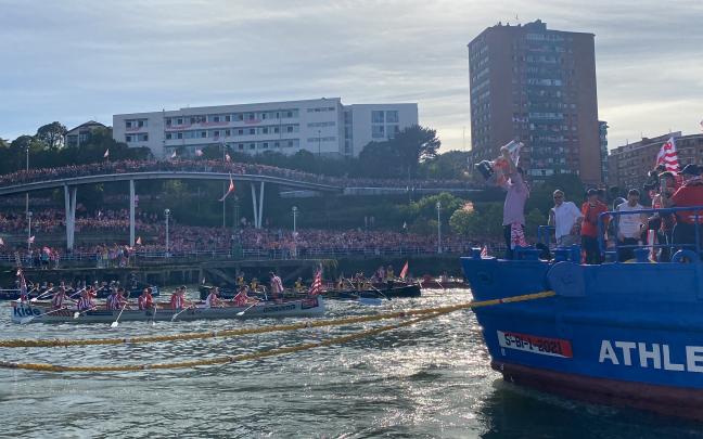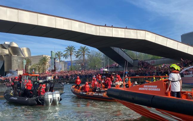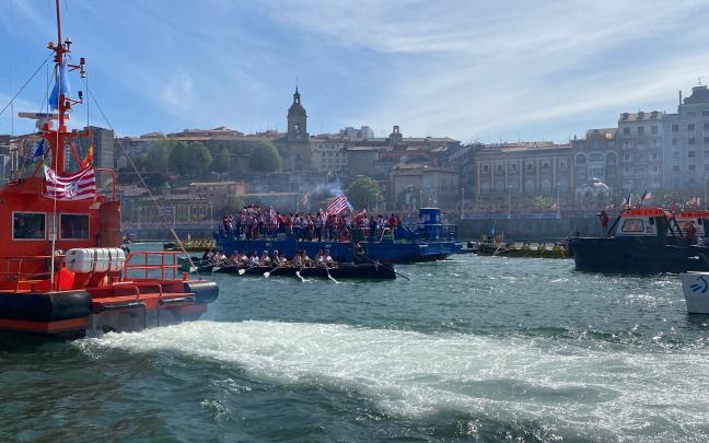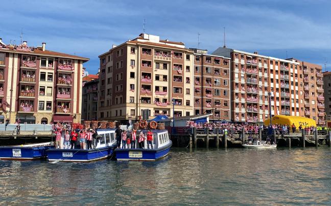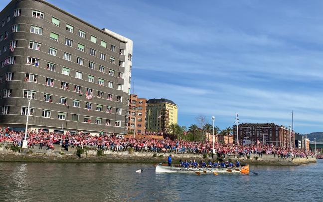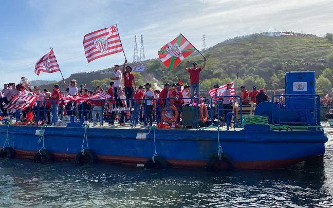Tras su salida de Getxo, la Gabarra ya ha atravesado Lamiako rodeada de miles de aficionados.