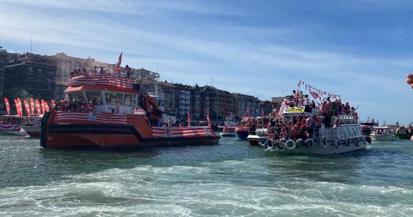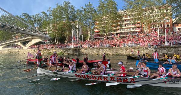 Una vez llegada a Bilbao, y con los jugadores ya sobre el balcón y toda la atención fijada en ese punto, la Gabarra volvió acompañada de la puesta de sol al punto de partida del recorrido sobre la ría para poner el punto final a una cita inolvidable.