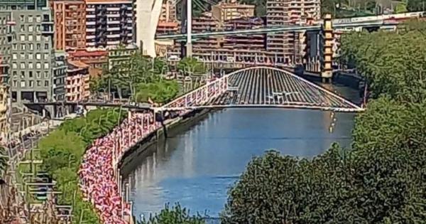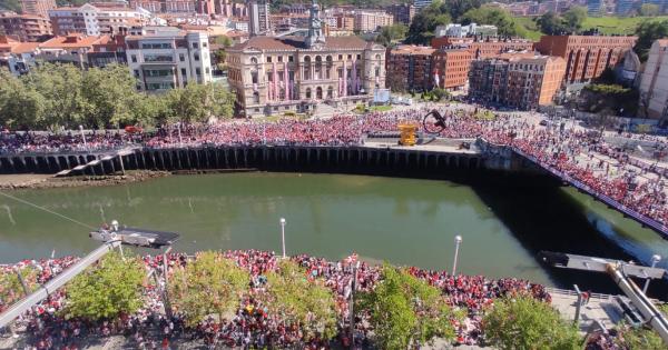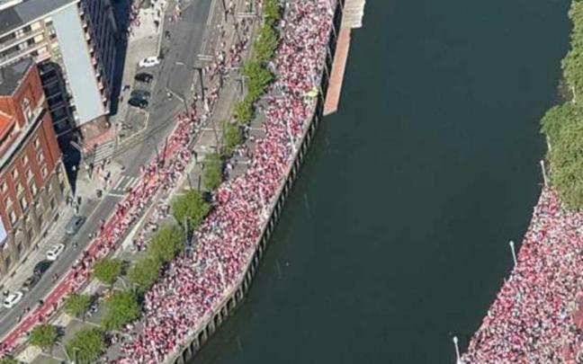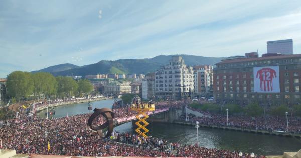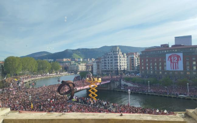 Uno de los puntos clave, la zona que rodea al Ayuntamiento de Bilbao, ya se encuentra llena por miles de personas a falta de 6 horas para la llegada de los jugadores y la Gabarra al final de su travesía por la ría de Bilbao.