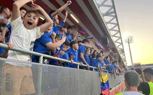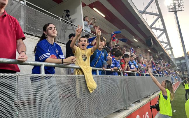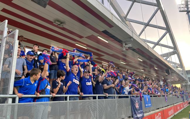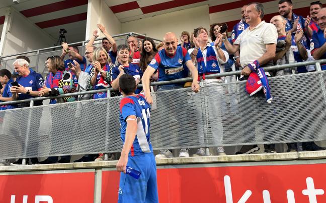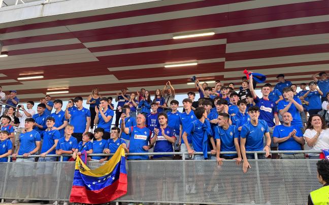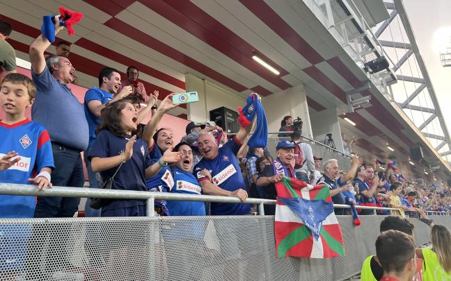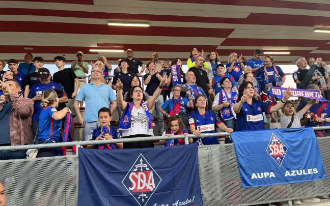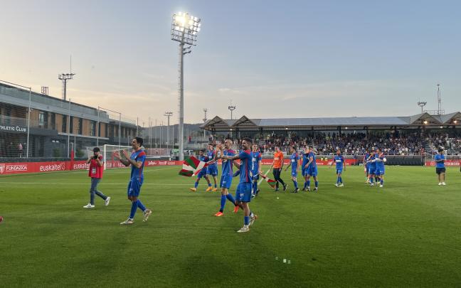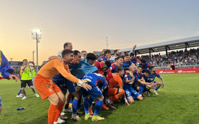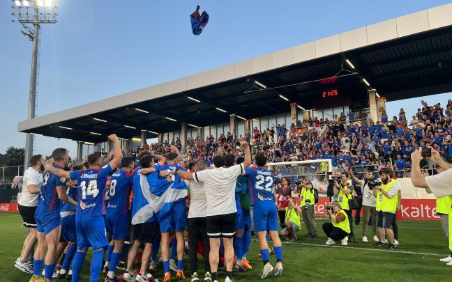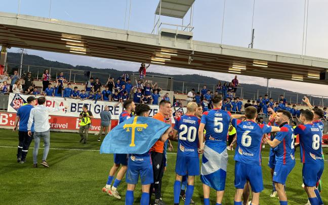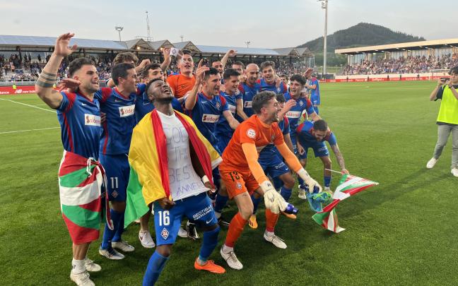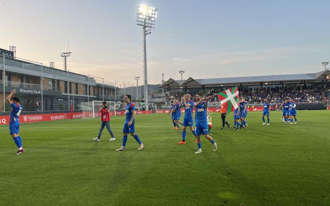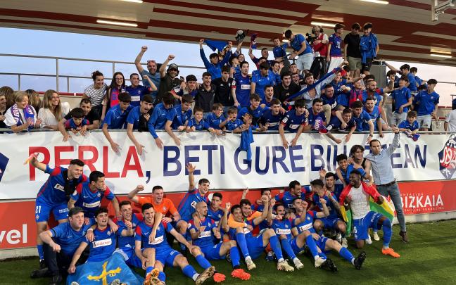 Los jugadores de la SD Amorebieta celebran junto a la afición desplazada hasta Lezama su ascenso a Segunda División