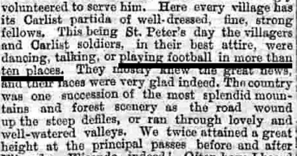 La base de todo esto se encuentra en la crónica del corresponsal del London Evening Standard durante su viaje de 48 horas en carruaje desde Tafalla hasta Bayona, pasando por Pamplona y aprovechando un breve periodo de calma a finales de junio de 1874 tras la caída del general republicano Manuel Gutiérrez de la Concha en la batalla de Abárzuza. “Siendo este el día de San Pedro, los vecinos y soldados carlistas, con sus mejores galas, bailaban, conversaban o jugaban al fútbol en más de diez lugares”, dice. Y no extraña, según el blog, “pues debemos tener en cuenta la cercanía de Navarra con Euskadi, algunos de cuyos habitantes, según la prensa inglesa, ya practicaban el fútbol en 1858”.