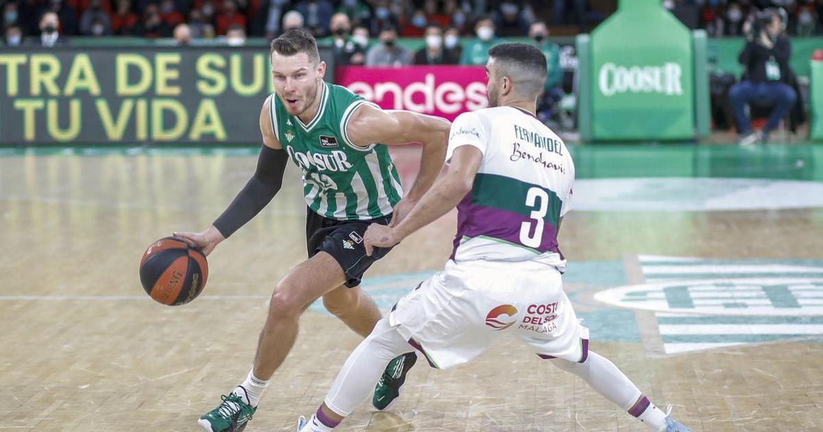 Dairis Bertans, que la próxima temporada seguirá militando en el Coosur Betis, penetra a canasta ante Jaime Fernández.