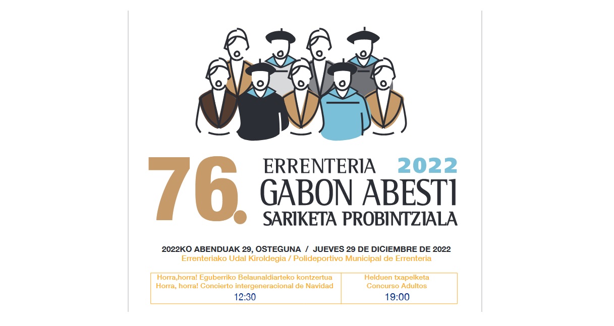 Ya por la tarde, a partir de las 19:00h, será el turno del concurso tradicional de villancicos para coros adultos, tanto populares como federados. Una cita que recupera su formato presencial y en la que, este año, participarán 6 coros. Tres de ellos son de Errenteria: Garrintzi, Gazte Kemena y Galtzagorri. Completan la lista Zarautz Abesbatza, Eresargi de Villabona y Iesu Abesbatza de Donostia. Optan a tres premios de entre 800 y 400 euros.