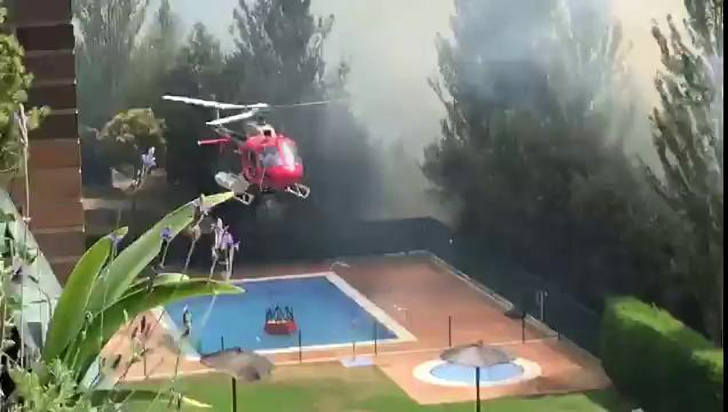 Javier Vergara, inspector de Bomberos de Alava, analiza la maniobra de un helicóptero de bomberos en una piscina privada en Olloki que extrajo agua para sofocar un incendio