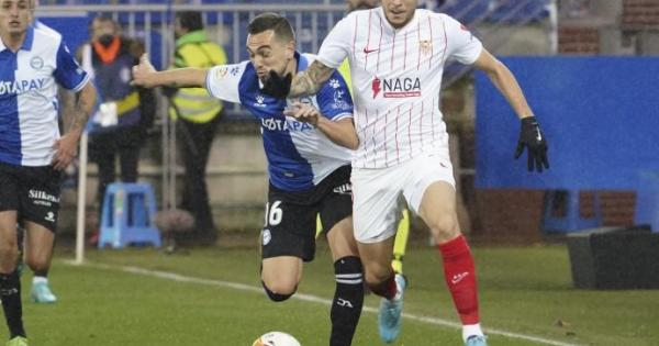 Gonzalo Escalante disputa un balón con Ocampos durante el último choque entre el Alavés y el Sevilla en Mendizorroza.