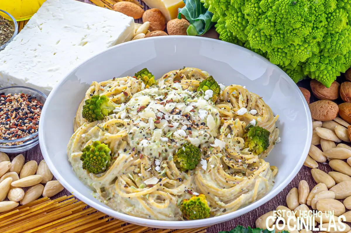 Disfruta de unos espaguetis con un cremoso pesto de romanesco al horno con queso feta y almendras. Una receta fácil y sabrosa para llevar tu pasta a otro nivel.