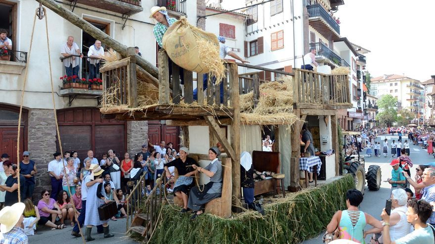 Tras las banderas, tal y como anunciara la asociación, todas y cada una de las 15 localidades de valle acudieron con sus carrozas, algunas más elaboradas que otras, acompañadas de vecinos y vecinas que participaban en los teatros o coreografías preparadas para la ocasión. Tras cada carroza, dantzaris y músicos provenientes de diferentes rincones de Euskal Herria. Centenares de personas disfrutando como hacía tiempo y haciendo disfrutar al numeroso público.