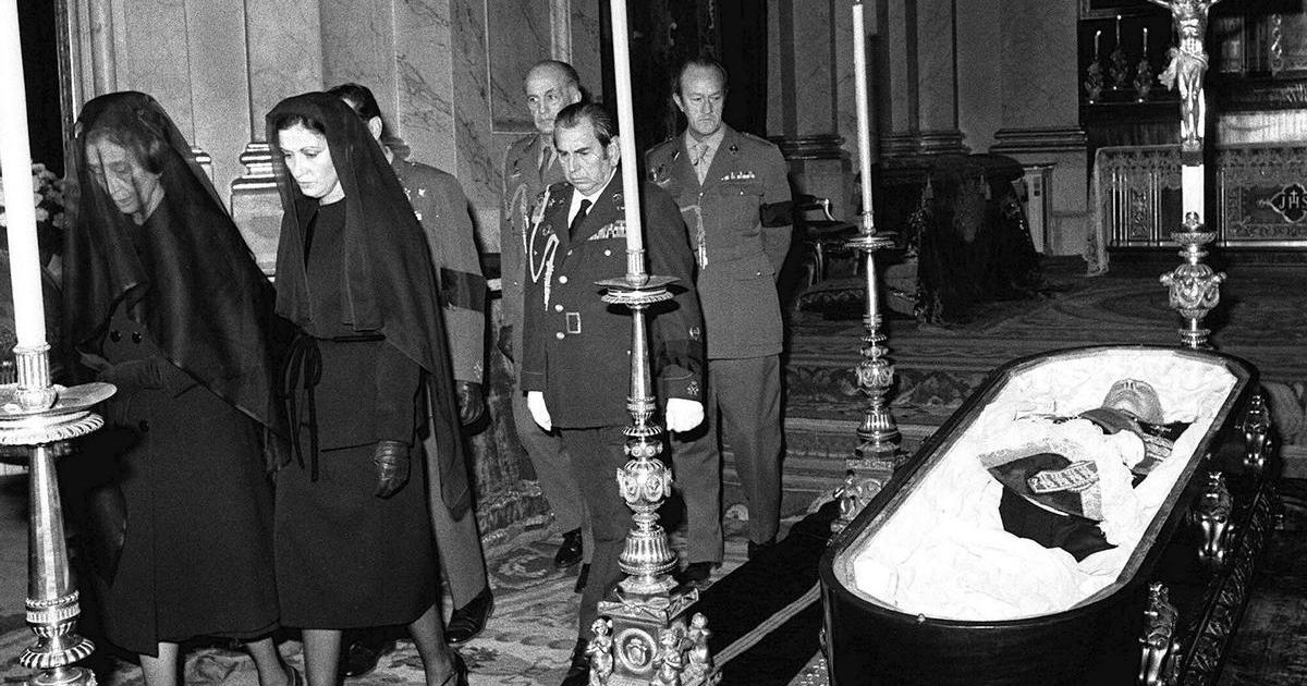 La viuda de Franco, Carmen Polo, y su hija, la marquesa de Villaverde, durante el funeral en El Pardo con el féretro presente.