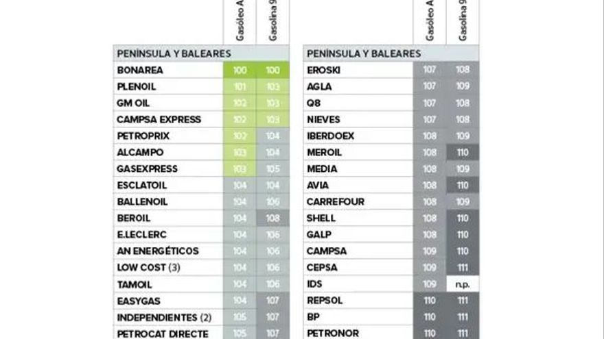 El estudio, publicado en la revista Compra Maestra de julio, revela que BonÀrea es la cadena más barata en gasóleo A y gasolina 95, con supermercados y estaciones de servicio en Cataluña y zonas limítrofes de Aragón. Le siguen las cadena de gasolineras automáticas Plenoil, GM Oil (ligada a los cash GM) y Campsa Express, la variante low cost de Campsa. Petroprix iguala a las anteriores, pero solo en diésel. Por el otro extremo y para el caso del gasóleo, las más caras son Repsol, BP, Petronor, Petrocat y Valcarce. Sus precios son al menos un 8% más onerosos de media que las más baratas, lo que supone un sobrecoste de hasta 0,18 euros/litro. También Petrocat y Valcarce son las más caras para gasolina 95, con una diferencia que supone hasta 0,20 euros/litro.