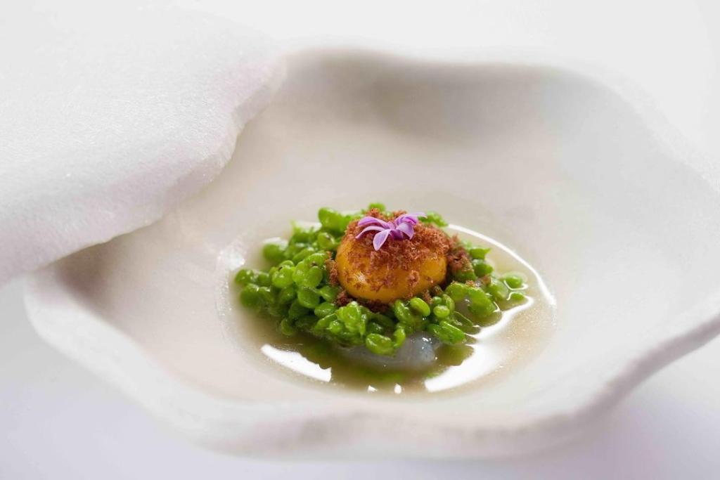 Guisante del Maresme, quisquillas y yema ahumada. Foto: concursococinerodelano Le siguió como preparación principal una raya meuniere y matices mediterráneos, en la que llama la atención la sencillez en la preparación y presentación. Pero la riqueza de sabores y matices la llevan a lo más alto este plato.