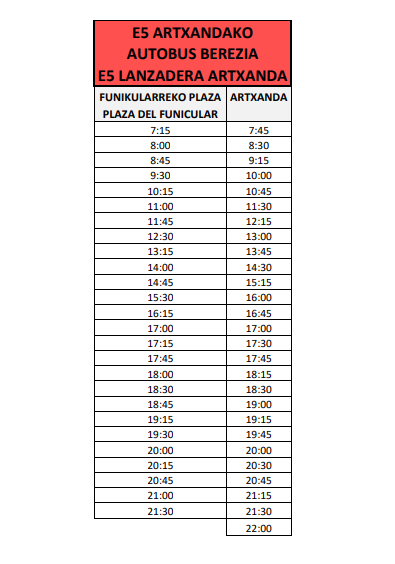 Se establecerá un servicio especial de autobús lanzadera (línea E5), cuyo horario se detalla en la tabla adjunta, con el fin de reforzar el transporte entre Bilbao y Artxanda.