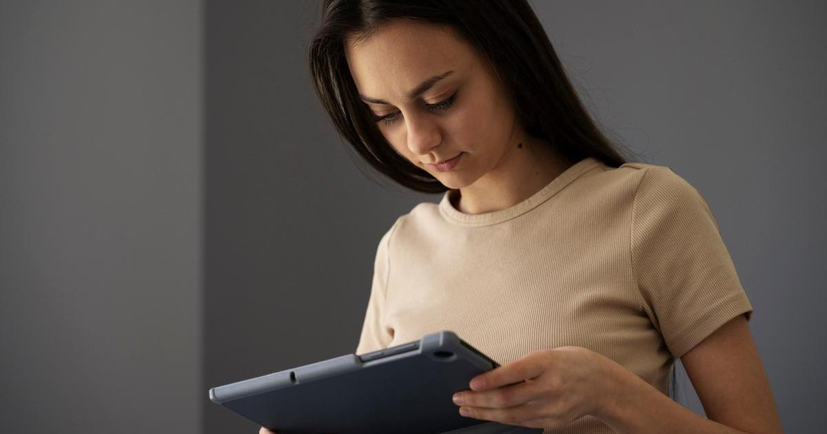 Mujer sosteniendo un dispositivo electrónico.