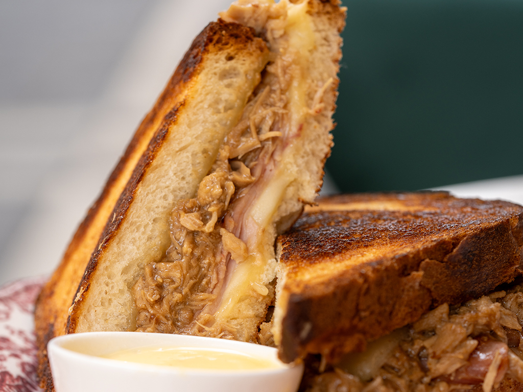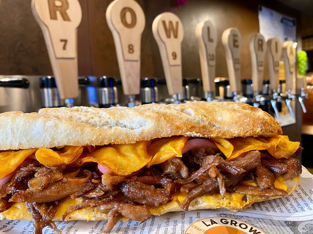 Este bocadillo que preparan en La Growleria tiene como ingredientes parmentier de boniato, codillo de cerdo macerado en salsa teriyaki a baja temperatura, cebolla morada encurtida, ralladura de naranja, chips de boniato y pan de bocata crujiente.