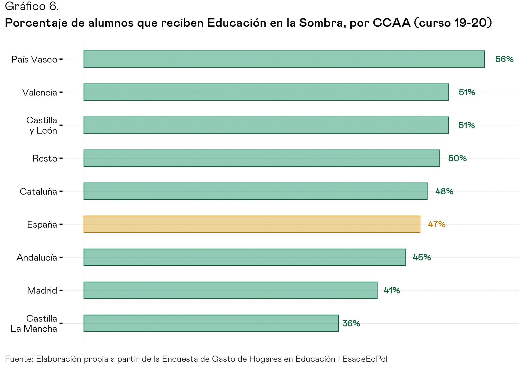 El estudio concluye que las dimensiones del mercado de clases particulares en el Estado “son aún mayores” de lo estimado a partir de las Encuesta de Presupuestos Familiares (EPF). Según la Encuesta de Gasto de Hogares en Educación (2019/20), el gasto total ascendió a 1.700 millones de euros, frente a los 850 millones estimados a partir de la EPF ese mismo año. Según Esade, el porcentaje de estudiantes que reciben clases particulares es muy considerable en todos los hogares con hijos en edad escolar (47%): un 46,5% de los alumnos en la red pública y un 50,1% en la red concertada. En el caso de Euskadi, ese porcentaje sube al 56%, le sigue Valencia y Castilla León (51%).