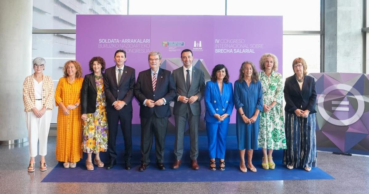El vicelehendakari, Mikel Torres, y representantes de Gobierno central y vasco, Emakunde y Ayuntamiento de Bilbao en el congreso internacional sobre brecha salarial de género en Bilbao.