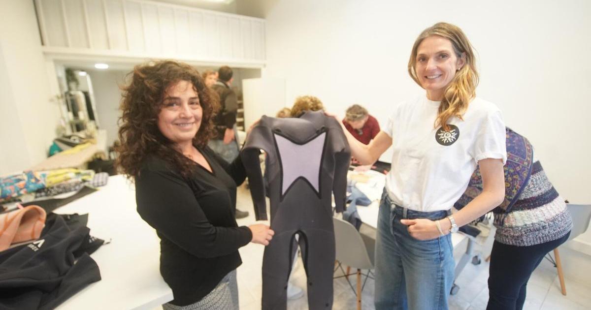 La otra vertiente que marca el trabajo solidario de Euskadi Surfari es la recogida de material deportivo, principalmente trajes de neopreno, tablas de surf y accesorios. A partir de ahí, caben dos opciones con este material que ya no se usa. “Si los trajes están bien, los reutilizamos y se los damos a alguna de estas personas para que sea independiente y pueda meterse al agua cuando quiera”, explica Teresa. Sin embargo, a menudo muchos trajes llegan seriamente deteriorados y ya no sirven para surfear. Durante un tiempo, en la asociación fueron acumulando montones de neoprenos con idea de darles una segunda vida. Y así fue como, según cuenta Teresa, entró en escena Pili Jiménez, de la tienda Muchas Telas de la calle Hondarribia 31, ubicada en el centro de Donostia.