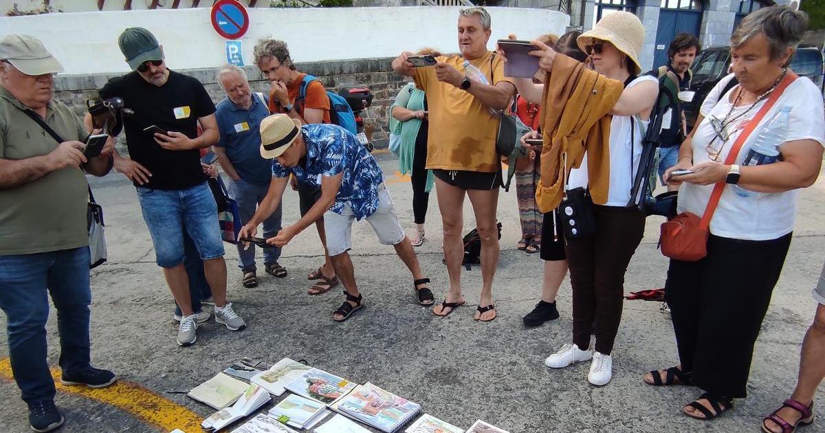 Respecto a los materiales utilizados, el artista nos explica que, como dibujan en directo y en la calle, hay determinadas cosas que son más cómodas y funcionan mucho mejor en los cuadernos. Al final, se acaban imponiendo lápices, rotuladores, tintas..., porque son cómodos. También, “aunque dominar la acuarela ya es otro mundo”, es sencillo de ejecutar y transportar. “Con muy poco material puedes hacer mucho”, destaca. Lo que él lleva siempre es una cajita con colores de acuarelas y un pincel recargable (con un depósito de agua). “Esto lo inventaron los japoneses, hay gente que lleva menos”, sonríe.