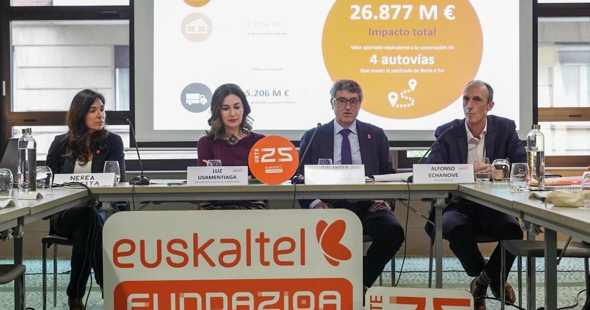 Los responsables de Euskaltel presentaron el informe ‘25 años dando alas a nuestras raíces’, un documento que estima en más de 27.000 millones el impacto socioeconómico directo generado por Euskaltel y su fundación gracias a su “firme compromiso y vinculación social y emocional con Euskadi”. En concreto, la actividad empresarial de Euskaltel desde el año 2000 ha producido un valor de 15.142 millones de euros que corresponden al mercado directo generado a través de productos, servicios, empleo y relaciones comerciales.
