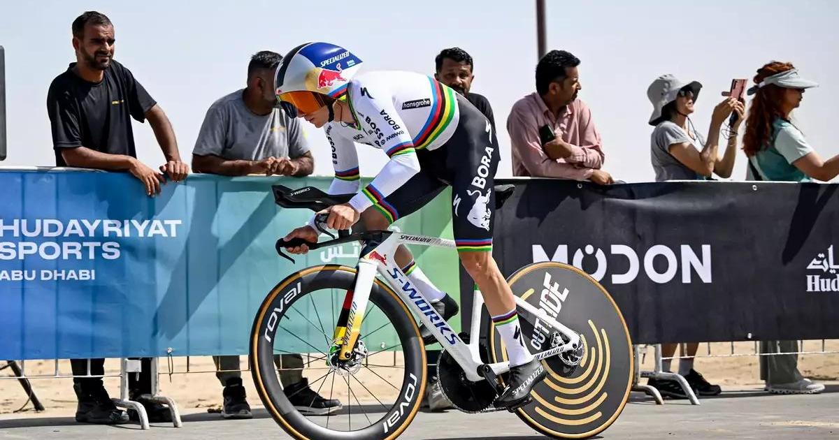 Un reloj de arena midió la crono del UAE Tour, que enfatizó a Remco Evenepoel, tan veloz, un cohete atravesando el paisaje rectilíneo, llano, que su bici, agitaba el polvo a su paso.