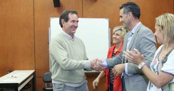 Aguirre recibiendo el homenaje durante la entrega de premios deportivos de la UPNA.