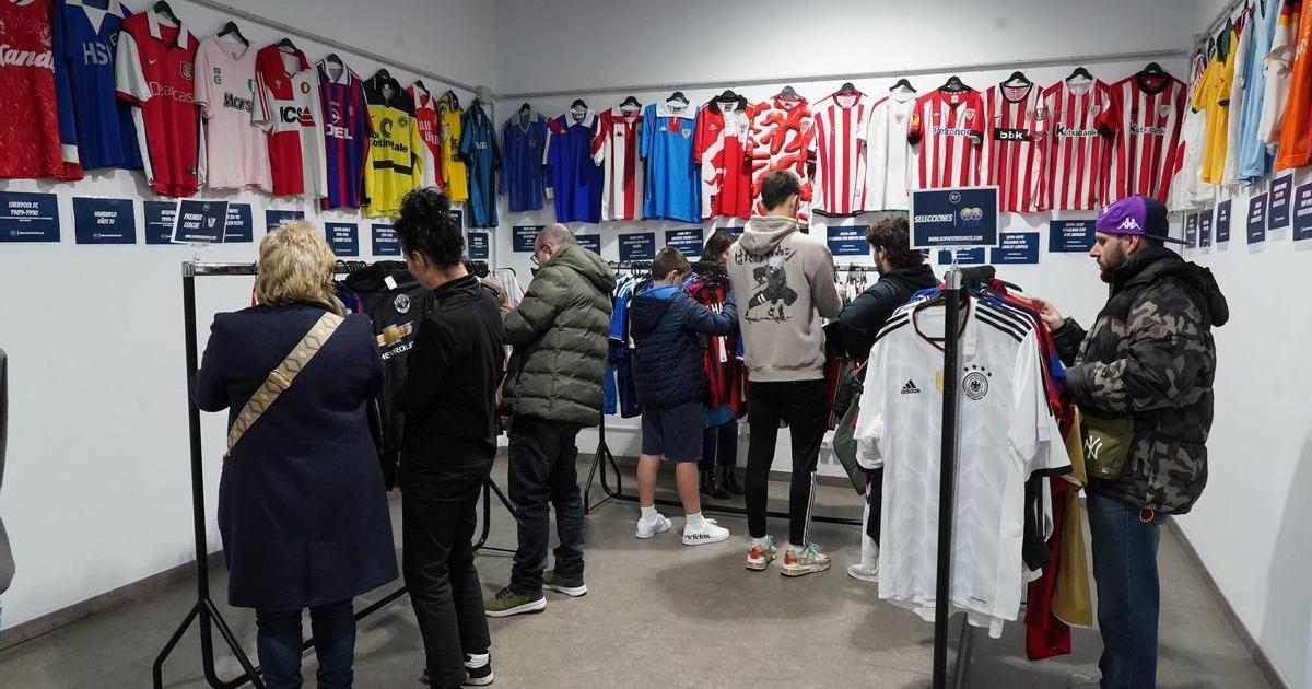 “Hay algunas muy extrañas y que no había visto nunca”, dice Eneko, uno de los potenciales compradores en la pop up de camisetas deportivas vintage en Bilbao. El espacio de Yimby en la calle Iparraguirre 31 sigue atrayendo a bilbainos y bilbainas amantes del fútbol que desean tener alguna de estas piezas en su colección.