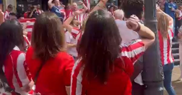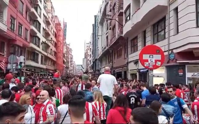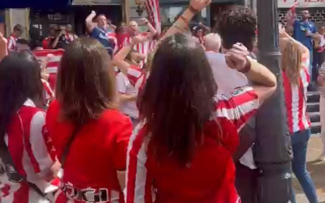 Los cánticos son una de las formas más tradicionales de animar a un equipo. En el repertorio de los aficionados del Athletic, el himno del conjunto rojiblanco no puede faltar y ya se oye en diferentes puntos de la ciudad.