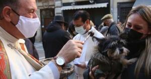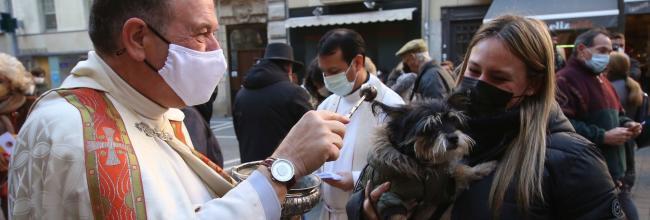 Con motivo de la festividad de San Antón, la parroquia de San Miguel de Pamplona celebró ayer el acto de bendición a las mascotas de todos los feligreses que así lo quisieran a las 12.30 y a las 18.30 horas. Así, perros, gatos, conejos y demás mascotas aguardaron frente a la iglesia de la capital navarra a la espera de que el párroco extendiera la bendición del Santo y deseara así a los animales un 2022 de buena salud.