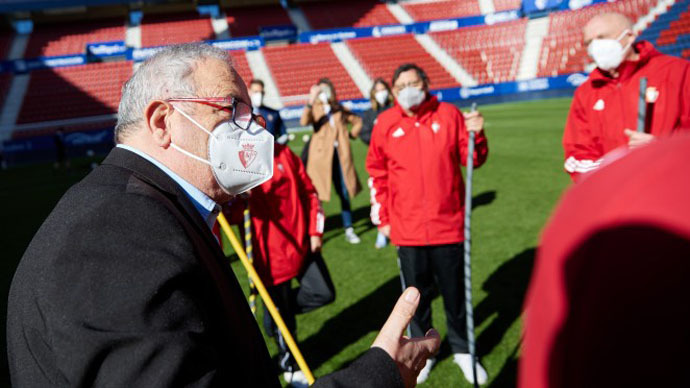 El Club Atlético Osasuna, de la mano de Fundación Osasuna y Fundación Solera, ha puesto en marcha una nueva actividad para mayores de 60 años. Un equipo oficial mixto de fútbol denominado 'FutboleANDO' con una regla imprescindible y esencial, No se permite correr€se juega andando. Se trata en realidad de un juego en el que solo se puede caminar y no se permite correr y que está diseñado para que las personas mayores puedan mantenerse en forma y permanecer activas independientemente de su edad o forma física. Es una modalidad que Osasuna ya impulsó junto con Fundación Solera a finales de 2019, pero que la pandemia del COVID-19 trastocó hasta nuestras fechas. Esta misma semana, los jugadores de 'FutboleANDO' han tenido la oportunidad de llevar a cabo un entrenamiento en el estadio de El Sadar y de conocer a los jugadores de la primera plantilla del club. El presidente de la entidad, Luis Sabalza, fue el encargado de darles la bienvenida.
